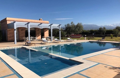 The CLOS DES ÉTOILES located 15 minutes from the Royal Golf and Amelkis less than 30 minutes from Marrakech, welcomes you all year round for your group stays, with friends, family or for all your small private events and events. company. The Villa offers unique reception capacities in Marrakech, thanks to its huge living room serving as a modular banquet room that can accommodate all the guests at the table. Its huge swimming pool and its shaded terrace, decorated with a pool house and a fully equipped outdoor kitchen, as well as its garden with trees and flowers, will enhance your stay. The Domaine can accommodate 14 people in its 7 very comfortable rooms.