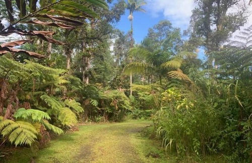 This tranquil oasis amidst old-growth ‘ōhi‘a forest sits conveniently halfway between Hilo and Volcano and just minutes from the highway. Relax in the embrace of the Lemon Tree Lanai, a detached unit featuring a long, sunlit, screened lanai with seating area, dining area, and kitchenette. Double doors open into a small living room, bedroom, and private bath. Kitchenette includes ¾-size fridge, cook top, microwave, and toaster oven, along with coffee maker and electric kettle.