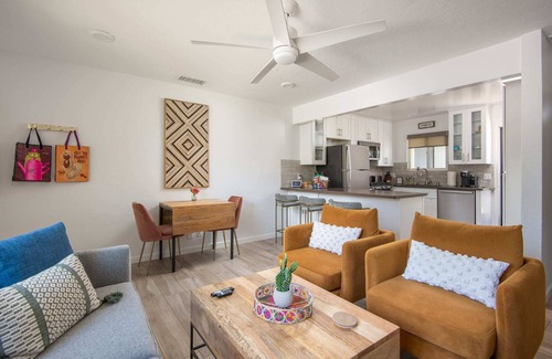 Sleeps up to five on approval. One king-size bed, one queen-size bed, and a sofa which we can provide bedding upon check in for an additional $20/night fee. Guests have the entire bungalow to themselves along with a private fenced in yard. Yale keyless door entry coded uniquely to each guest.