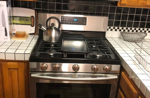 • a kitchen with new appliances (oven, dishwasher, microwave), a coffee maker, microwave, blender, toaster, waffle maker. The kitchen is fully stocked with cooking utensils;