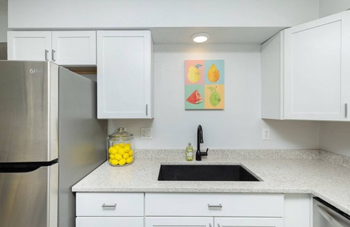 The kitchen has all of the basics for a quick stay or a long-term stay! Coffee and tea are provided with cream and sugar to start your days off right!