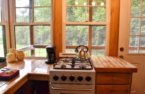 Kitchen: Little Miss Sunshine's kitchen has a propane stove with oven, fridge with small freezer, double basin sink, coffee pot, toaster, cookware, dishware, soap and kitchen towels. The kitchen is surrounded on 3 sides by large, sunny windows that overlook the farm field, fruit trees and solar panel array.