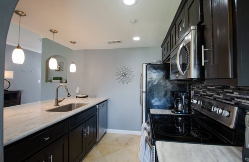 The kitchen is fully stocked with stove, microwave, refrigerator, dishwasher, cookware, dishes, flatware, glasses, panini maker, and off course a Keurig coffee maker. An electric grill at the balcony complements all you need to make your own food if desired (Walmart and Kroger are within 6 miles).