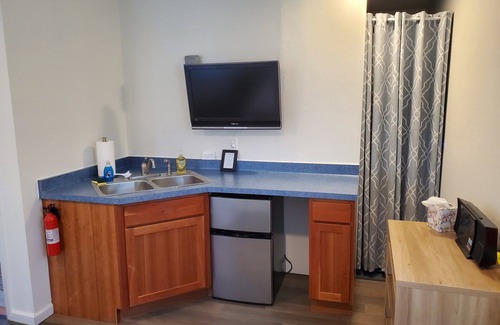 1st floor. Enjoy an efficiency kitchen with sink and mini fridge, table for 2, Queen size bed, and half bathroom. Air conditioning is provided by window unit. Private entrance and deck that overlooks the lake.