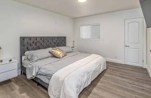 The “main bedroom” is outfitted with a king-sized bed, 2 bedside tables, bedside lamps, a closet, and a 55” Smart Roku TV.