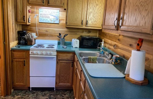The downstairs consist of a fully furnished kitchen- laundry room, one bathroom, living- dining room combination and a locked storage room. Musky Cabin has musky decor throughout and handmade railing from tier poles in an old tobacco barn from the farm I grew up on!