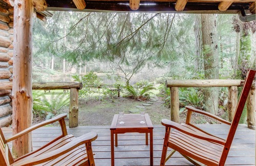 Awaiting you back home is a truly serene location with tall green pines swaying in the breeze. Admire the rustling ferns from the seat on the cabin's covered porch, or take a seat at the rocking bench by the duck pond as the kids feed the birds.