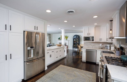 The kitchen is equipped with a refrigerator, freezer, ice maker, dishwasher, microwave, stove, oven, blender and a toaster