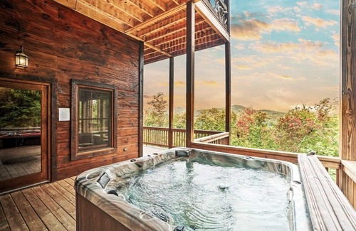 Elevating your escape are panoramic mountain views that will take your breath away! As the sun sets, gather around the fire pit to bask in its warm glow, or indulge in the relaxation of the hot tub that invites you to unwind!