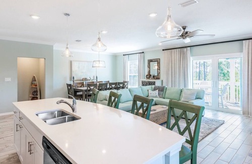 Escape to this ideal family beach vacation home, complete with a stylish living room adorned in cool oceanic hues and an eclectic yet cozy design. Take pleasure in streaming your preferred shows and films on the enormous 75” 4K UHD Smart TV and indulging in board and card games provided on the coffee table. The spacious kitchen is equipped with a French door fridge, Keurig, drip coffee makers, and a long breakfast bar that seats four people comfortably. The 10-seat dining table is perfect for family meals and gatherings.