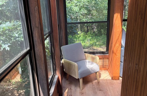 The true showstopper is the back bedroom, where oversized wraparound windows make you feel like you’re nestled in the trees. It’s a quiet, sun-drenched space perfect for reading, resting, or just enjoying the peaceful surroundings.