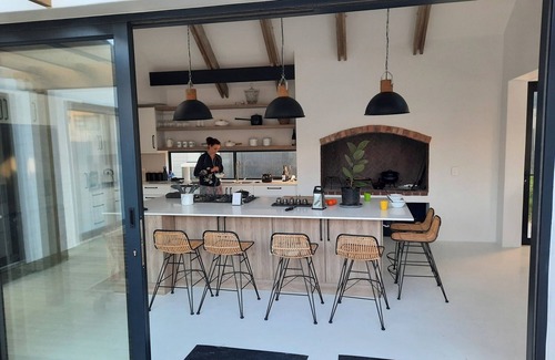 The heart of the house is a large kitchen centred around an island with a view over the deck. The kitchen boasts an extensive indoor braai set-up with all the tools and equipment.