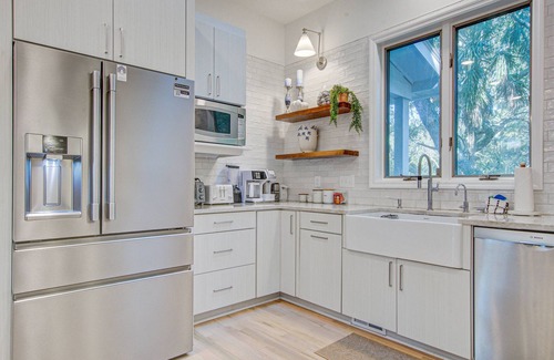 Stroll home from the beach for a refreshing dip in your private backyard pool. Chaise loungers invite you to soak up the sun, and the covered patio offers space for alfresco meals at the table for four.