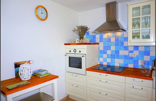 It offers everything you need — a fully equipped kitchen and a bathroom with walk-in shower, bidet, and towels. On the first floor, accessible by a spiral stairway, is a lovely and spacious air-conditioned bedroom with a king-size bed and a flat-screen TV. Linens and towels are also provided. Parking space and outside furniture with a sitting area are available for use.