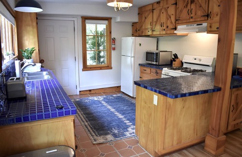 The apartment itself is lovely, comfortable, and quite large at 800 sf plus patio. It is a terrific value considering the grounds and the location. It has been recently renovated, and has a fresh new feel. The entry steps are entirely rebuilt, with great lighting and handrails. There is an in-unit washer/ dryer, a 50' HD flatscreen TV, a beautiful new dining set, and head-to-toe redesign including new light fixtures, window treatments, bed linens, throw pillows and more. It all feels very fresh and stylish. The one thing that hasn’t been redone is the original kitchen, whose retro vibe we love. It retains its’ funky handmade oak cabinets, blue tile counters and spanish tile floors. (I swear I grew up in that kitchen!) The apartment comfortably sleeps 3, with an enclosed bedroom and a twin bed/ daybed in a nook off the living room. Both of the beds are exceptionally high quality and comfortable, as are the linens and pillows; We take our sleep quality seriously here! The main bedroom features a premium latex bed and the twin bed nook a new Puffy memory foam mattress. The unit comes with a small patio, a private entrance and one parking space. It is quiet, serene, and ridiculously safe, with woodland views from every window. THINGS TO NOTE: This is a ground floor unit in a family home, so guests should expect there to be some upstairs noise: footsteps, voices, barking, etc. Most of our guests are entirely fine with the noise level, but very noise-sensitive folks might not find this unit comfortable.