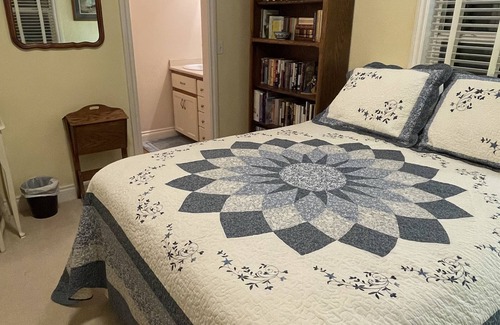 The yellow queen room has it's own private half bath. It also has a mounted smart TV over the desk & chair. Use the dresser to get your clothes out of your suitcase. The closet is for your hanging clothes and also has an ironing board and iron. Also in the closet is a small kitchenette set-up with microwave, refrig, coffeemaker, dishes & utensils. We also stock the frig with continental breakfast foods and drinks.
