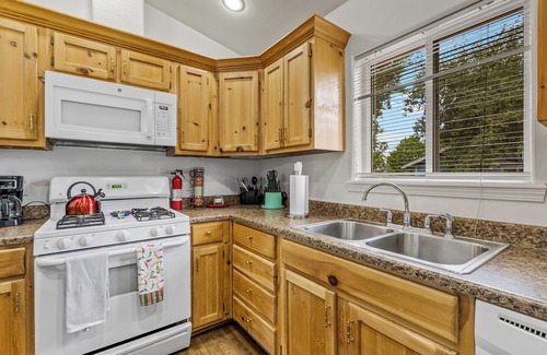 The Orange Blossom home sits right in the heart of downtown Williams, AZ. It has been completely remodeled, and has Air Conditioning, a dishwasher, and lots of space for your family. Home features 3 bedrooms. 3 sofa sleepers with twin beds. Plenty of area for everyone for your entire family to enjoy, everything is all on one level, no stairs. The backyard is landscaped with plenty of gravel and lots of trees that surround the property. Enjoy a backyard barbeque with a propane grill and patio set.