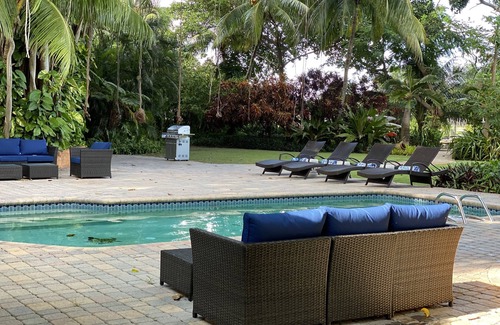 Amazing 4500 sq ft home with heated pool nestled within a 1/2 acre lot with tropical, lush gardens.
