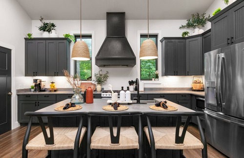 The sun‑filled kitchen flows into a dining area for eight and a living room furnished with a plush sectional, soft blankets and a stone gas fireplace, ideal for movie nights or board‑game marathons. Ceiling fans, area rugs and hardwood floors add comfort. Bedrooms are furnished with hotel‑quality mattresses, crisp linens and smart TVs. The master suite includes a spa‑style bathroom with a walk‑in shower featuring multiple sprayers and a live‑edge wood vanity. Two additional bathrooms provide rainfall showers and ample counter space.