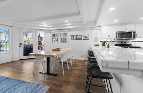 As you ascend the stairs, you'll be greeted by half bathroom and an open-plan living area with vaulted ceilings and large windows that offer sweeping views of Belmont Park and the beach. The kitchen is equipped with modern stainless-steel appliances, ample counter space, and everything needed to prepare meals for a large group. Adjacent to the kitchen is a dining area that seats eight, perfect for shared meals and game nights.