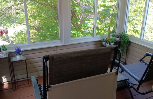Stairs lead up to the second floor with 3 comfy bedrooms and 2 full baths. The master bedroom is about the size of many hotel suites and has both a queen and a full bed along with its own private 2nd level sunroom. All bedrooms have a small programmable safe 6"W x 5"T x 6"D, privacy door chain locks, smart TV, table fan and mirror. Portable playpen and high chair available upon request.