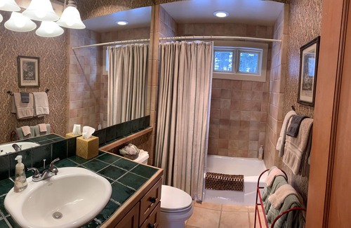 You will walk up a short but slightly steep path onto a large redwood deck before entering the cabin. You may not want to enter as you will be so engrossed with the gorgeous view. Fortunately for our guests, the whole front wall is floor to ceiling glass so you can also enjoy the view from inside. The main room is an open format living, dining, kitchen. The west bedroom has a beautiful handmade bunk bed with a twin bed over a double bed and the east bedroom has a queen bed. The living area also has a flat screen smart TV (no satellite). The gas fireplace is shaped like a wood stove and heats the whole cabin with the touch of the thermostat.