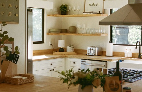 With an open concept and seamless flow, this new home is truly perfect for families, groups of friends and couples who are looking for a luxurious and peaceful escape. The home features soft dimmable lighting throughout, custom live edge pass through kitchen window for ideal indoor/outdoor dining, luxury outdoor living, 6-burner gas grill, premium stainless steel Smart Samsung appliances and front load washer/dryer, butcher block countertops. This well equipped kitchen has every essential, cookware and gadget imaginable.
