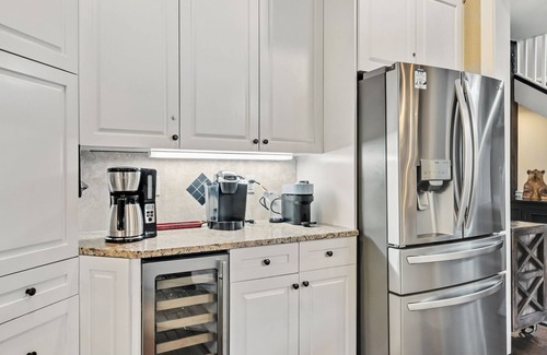 — Kitchen (Stainless steel appliances, drip coffee maker, Keurig, gas range, wine cooler, cooking utensils, tableware)