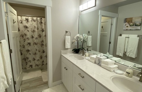 In this brand new home, you'll have access to an ample 1,600 sq ft beginning with a garage, parking pad and private entrance. The master bedroom and one guest bedroom each have beautiful King Beds, and the second guest bedroom contains queen over queen bunk beds - all topped with beautiful and luxurious linens, pillows and blankets. Each bedroom has their own closet and 55" smart TV, along with an additional 65" TV in the living area. Bathrooms are equipped with soaps, towels and blow dryers.