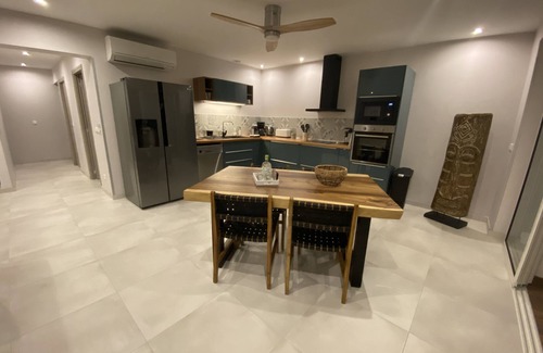 - 2 master suites with very comfortable bedrooms (One with King size bed, comfortable bedding, the other with two beds that make a king size (very comfortable bedding) by bringing them together (possibility of 2 children therefore), open onto a tropical garden. They each have air conditioning, a ceiling fan, a smart TV, a dressing room and an adjoining bathroom (West Indian shower).