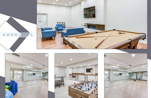 Our community offers a range of amenities to enhance your living experience, including a pet spa, conference rooms, and a work-from-home business center. Stay active with our wellness studio and stretching area, expansive private outdoor dog park, and fitness center with on-demand fitness. Enjoy outdoor cooking and dining with our outdoor kitchen and grilling areas. Relax in our rooftop firepit lounge with a big screen TV and sunning beds, or in the fireplace lounge with a full kitchen, big screen TV, and dining area. Engage in fun activities in our game lounge featuring billiards, shuffleboard, and foosball, or unwind in the sports lounge. Our community is 100% smoke-free and provides free high-speed Wi-Fi with up to 200 Mbps upload/download speeds. Experience convenience with self-check-in and check-out via smart lock, instant communication and friendly support from our team, and easy access to major roads and highways. Each unit includes a washer and dryer, AC and heating for full temperature control, a 55" HD smart TV, kitchenware and silverware for home-cooked meals, and memory foam pillows for a comfortable sleep.