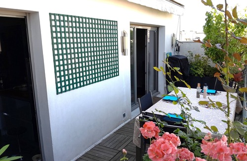The living room, dining room and kitchen all open on a private terrace offering a direct view on the Eiffel tower and equipped with a table for up to 6 guests. Dining or taking a drink on the terrace is a real pleasure in summer.