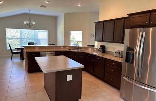 This beautiful home is very spacious and features a modern decor. Home does have a den that provides additional space and sleeper sofa. Central location of this home is very close to Brownwood but, Lake Sumter is definitely an option for you as well for dining and entertainment! Very large master bedroom with private bathroom. Large screen TV are provided along with free WI-FI! Grill is provided for those nights when you want to make your own lunch or dinner. Complimentary 2-person golf cart is
