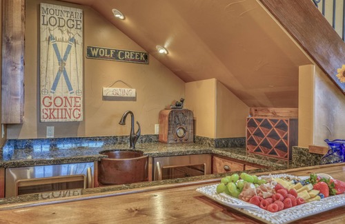 This stunning home is situated at 7,200 feet in elevation on five acres in Pagosa Springs. It offers incredible views of the San Juan Mountains from almost every window. Beautifully decorated and full of elegant mountain modern detail, this property will welcome you home from afternoons spent skiing, hiking, or rafting with three gas fireplaces, an expansive deck with a raised gas fire-pit, and in-ground gas fire pit outdoors where you can reminisce about the day's adventures. As the kids play in the fenced backyard or entertain themselves in the third-floor loft (with an air hockey table), the parents can watch movies on one of five flatscreen TVs or retreat to a spa-like master bath with a dry sauna, a Porcher air massage tub, and a multi-function shower. The gourmet kitchen is fully appointed with a Dacor six-burner gas cooktop, JennAir double wall oven, and Keurig/Cuisinart coffee makers, plus a wet bar with two cooling refrigerators and an ice maker. The large dining room is fully equipped with a second dishwasher and a sink.