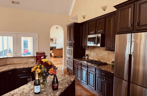 The kitchen is fully equipped for home-cooked meals or catering service. You'll find everything from pots, pans, and utensils to a coffee station with both Keurig and traditional options.