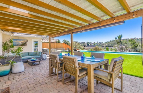 Enjoy a peaceful resort like stay at a private home in the heart of San Diego. Enjoy luxurious amenities! The backyard is where you’ll spend most of your time relaxing. Take a swim in the solar heated 65-foot salt water lap pool that’s 8 feet deep and soak in the 10-person hot tub (please refer to additional heating charges below) with the natural gas fire pit going, or relax in the 4-person infrared sauna. BBQ on the natural gas built in grill and relax in under the covered patio. If you’re feeling up to it go work up a sweat in the gym to start your day. No matter your preference, welcome to the perfect San Diego hub for the modern vacationer and turkey experience San Diego outside living.