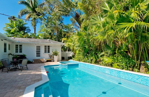 There are three doors out to the pool area, one from the apartment suite, french doors off the game room, and one from the bunk room that will invite you to a fabulous courtyard with mature, tropical landscaping. At night it is equally as beautiful, as it is lit up with landscape lighting and string lights above the pool. All pool doors have a sensor that will notify the main house that the door has been opened. The heated pool has a waterfall feature & a jacuzzi. The outdoor patio features four loungers, a dining set, an umbrella, and a grill. There is also a second seating area off the apartment suite where guests can sit in a separate private space on the other side of the house.
