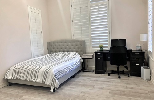 A fantastic luxury house for your family. It is a paradise-like place that will create the best memories for your family. The house offers exclusive amenities such as a 150-inch screen for movies, games, and a golf simulator. The backyard features comprise a salt pool, trampoline, a private tennis court and a private trail for your family's enjoyment. The luxury private saltwater swimming pool also includes an in-ground Jacuzzi with a fabulous view. Our fully equipped kitchen has all the necessary appliances to make meals for your family, including an incredible espresso machine and two dining tables with gas grills. Firewood is provided for the outdoor firepit. A nice-sized living room with reclining sofas is perfect for relaxation. There are plenty of fun activities to enjoy, such as swimming tubes and toys, two smart TVs, a big-sized trampoline, basketball, tennis court, darts, video console games, board games, a ping pong table, two gas firepits, and a natural/gas firepit. A professional 150" screen golf simulator system and movie/game setup are also available for your use. You can use all of these facilities privately, but the parking lot may be shared. The house consists of two units, with the renting unit around 2000 sq. ft and the other unit occupied by the owner. There is no privacy concern and no shared space. We only accept a small family who can maintain the house properly.