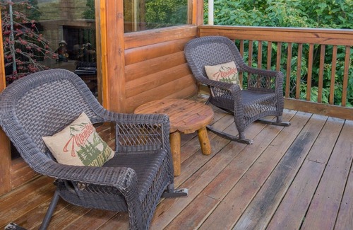 While you are out shopping at all the outlet malls, the guys can stay back at the cabin and enjoy the upstairs game room. They will love the air hockey table, or playing a friendly game of pool on the full size pool table, and if that's not enough, play a game of darts, while you watch TV...When you are ready to unwind for the day, and watch the most beautiful sunsets you have ever seen, grab a glass of wine and head to the hot tub on the second level deck. You won't ever want to leave....and if it's just the two of you, the red heart shaped Jacuzzi tub will be a perfect way to end your day. The king size log bed in the master suite has luxurious bedding & high thread count sheets to ensure a great nights sleep. When you arise you will have a fabulous view of the misty mountains, and don't be surprised when you hear Dolly's train whistle, your only minutes to Dollywood..