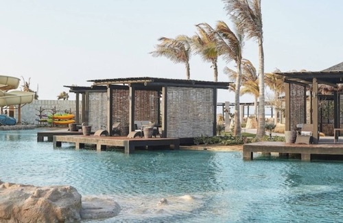 An outdoor pool and a children's pool, with a waterslide, cabanas, and sun loungers