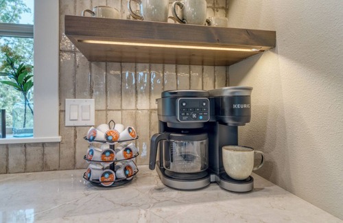 KITCHEN: Fully equipped, quartz countertops, tile backsplash, large island to cook or entertain, Keurig coffee maker, French press, coffee grinder, BBQ tools, plenty of cooking pots & pans as well as cooking basics such as oil, salt & pepper and other spices.