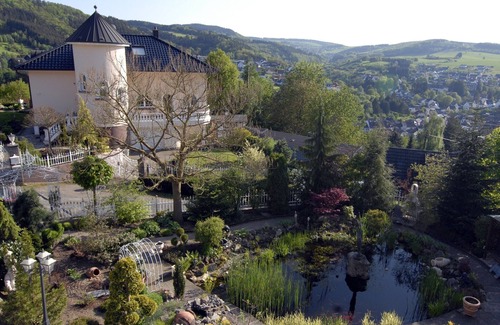 Large terrace and balcony with high quality outdoor furniture, elegant gardens with beautiful garden pond and planting, BBQ, parking spaces available, bicycle parking. Beautiful setting on the edge of the forest. Completely fenced. Magnificent views to the south of the valley. The local center about 1 km (shops, bakeries, cafes, restaurants, etc.). Bus stop about 700 meters away. By the Nürburgring about 4 km. Station: Ahrbrück 15 km away.