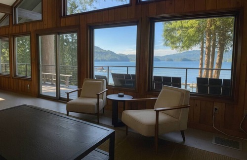 Framed by tall evergreens and perched above the glimmering waters of Lake Whatcom, this inviting retreat was designed for connection. With two thoughtfully crafted homes and generous gathering spaces throughout, it’s perfect for family getaways, friendly reunions, or celebrating something special. Floor-to-ceiling windows and expansive decks bring the outdoors in, while outside, a private dock, bubbling hot tub, lake view fire pit, and wide lawn continue the experience year-round.