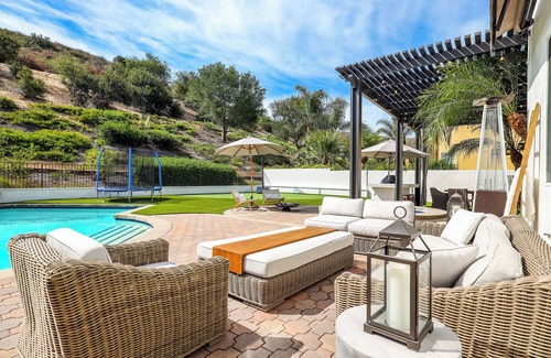 Beautiful 4-bed, 4.5-bath coastal California villa located in a luxury gated community less than a mile from the Pacific. Perfectly situated on a 12,000 square foot private lot with cool ocean breezes featuring a huge pool, spa, bbq, outdoor shower, basketball court, dining and lounging areas and more. Every bedroom has lovely views, and some have private balconies. The property backs onto a gorgeous nature preserve with miles of hiking and biking trails with ocean views. Inside the home has been fully renovated with wide-plank French oak flooring and beams, spa-like master bath with huge soaking tub, 2 fireplaces, Peloton bike, and much, much more. There are 3 dining areas that seat 24 people comfortably and the kitchen is fully stocked with fun extras like a fondue pot, pizza press, ice cream maker, air fryer and high-end espresso maker. The home comes complete with luxury towels and linens, bikes, surfboards and every amenity you need to make your stay comfortable. The villa is located in a very quiet neighborhood within minutes of Southern California's best beaches, restaurants and shops and just a short drive from major amusement parks, museums, mountain lakes and other attractions.