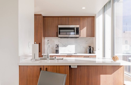 Experience SoMa, San Francisco's top downtown neighborhood, in this one-bedroom apartment with sunny California vibes. The apartment features a gourmet kitchen with premium stainless steel appliances, quartz countertops, rich walnut cabinetry and marble backsplashes; oak flooring; a serene bathroom; ample closet space; expansive windows; and an in-unit washer/dryer. The bed provided is queen size, fitted with plush linens and pillows. All Furnished Quarters apartments include 24/7 guest service.