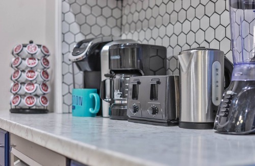 Fully Equipped Kitchen includes oven, refrigerator, microwave, coffee brewer, Toaster, Blender,pots. Stocked with cutlery, plates, bowls, cups/glasses and all the kitchen essentials.