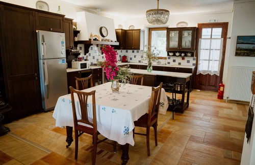 Amongst the olive trees, the fruit trees and the flowers, the traditional stone-built 160m2 villa is placed alone on waterfront, less than 30m from the estate’s “private” beach, with stunning view of the bay. It is decorated with respect to the island's tradition and architecture, with some exceptional antiques of the family, while at the same time provides all the comforts of modern living. It consists of :(a) 2 very big bedrooms, (b) 2 large bathrooms, one with bathtub and shower and the other with shower(with a washing machine), (c) a fully equipped kitchen, with all the facilities for cooking, pastry making, etc that has immediate access to the living room, (d) a large wooden roof living room, with byzantine-style marble floor and a fireplace. In the living room there is a sofa, that can be transformed in 2 separate beds.