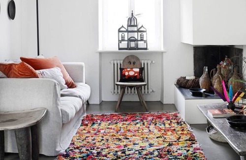 Adjacent to this room is the smaller second bedroom. This room is fresh and bright with its red, orange and white colour scheme. The curtains are a mix of sari fabric and white linen. A cosy Tyrol blanket and Etro cushions add texture to this charming room. Clothes hooks and baskets are provided as in the master bedroom.
