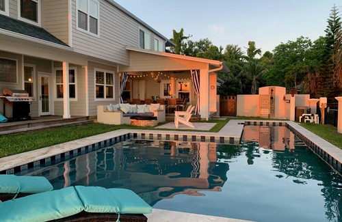 Beautifully renovated 6 bed, 5 bath home with all modern amenities. Pristine pool with lap lane, several porches for relaxing, paddleboards and kayaks, fully stocked kitchen, home gym, laundry, living and TV rooms with flat screen TV's all here to help you enjoy your stay. The home is close to so much here on the Space Coast - Kennedy Space Center, Ron Jon's, beautiful beaches, Orlando theme parks and more!