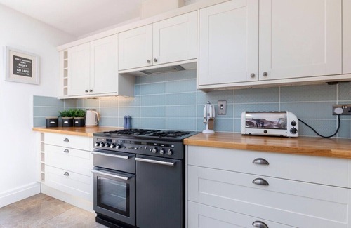 - The kitchen has an island with sink and dishwasher and breakfast bar for 2 along with a Rangemaster oven, gas hob and fridge freezer.
